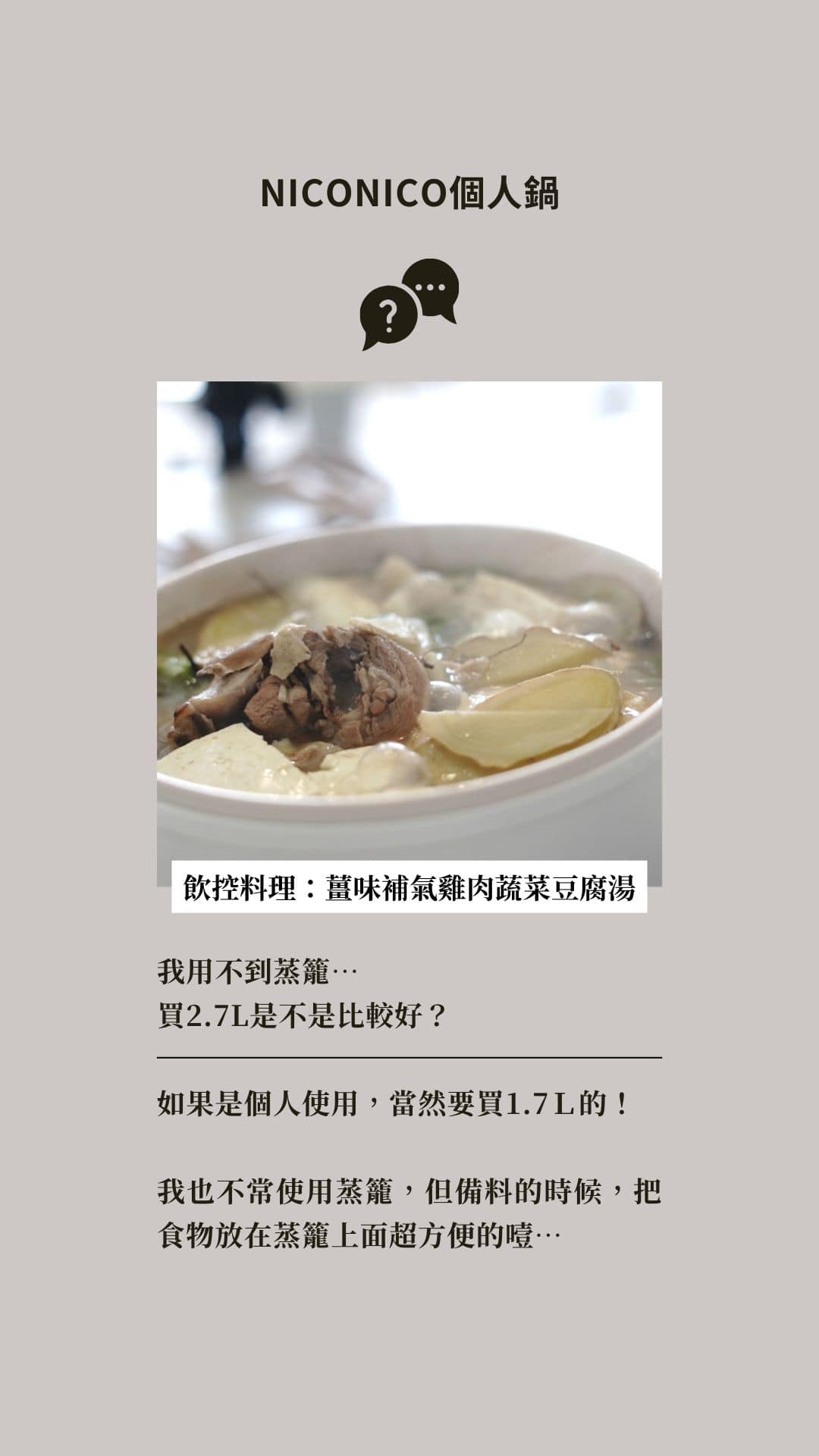 NICONICO個人鍋有另外附上小蒸鍋,可以蒸包子、饅頭、粽子等….食物;但更多的時候,我是拿來蒸飲食控制的食材:等待上方的食材蒸熟,鍋底也會逼出食材中的原汁,立刻就有現成的一碗小湯。