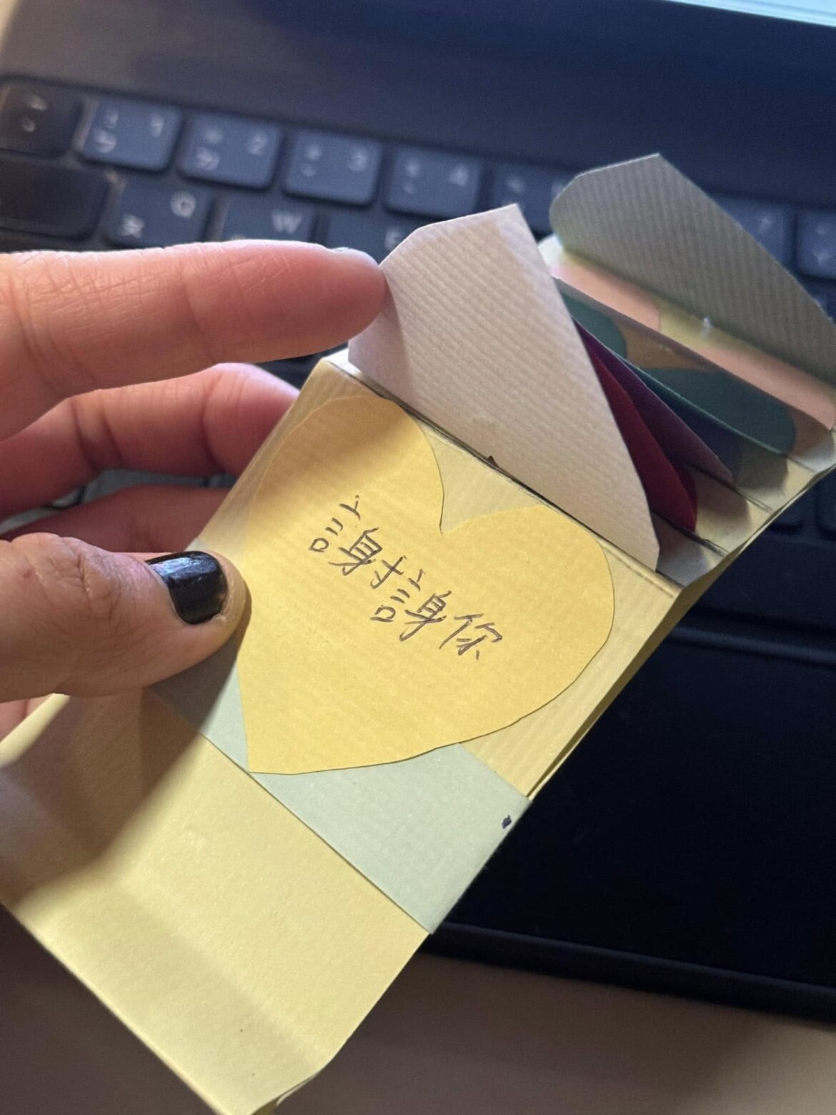 弟弟(應該是在姊姊的引導之下)做出了一張立體的愛心拉拉小卡片,上面謝謝我的日常各種: