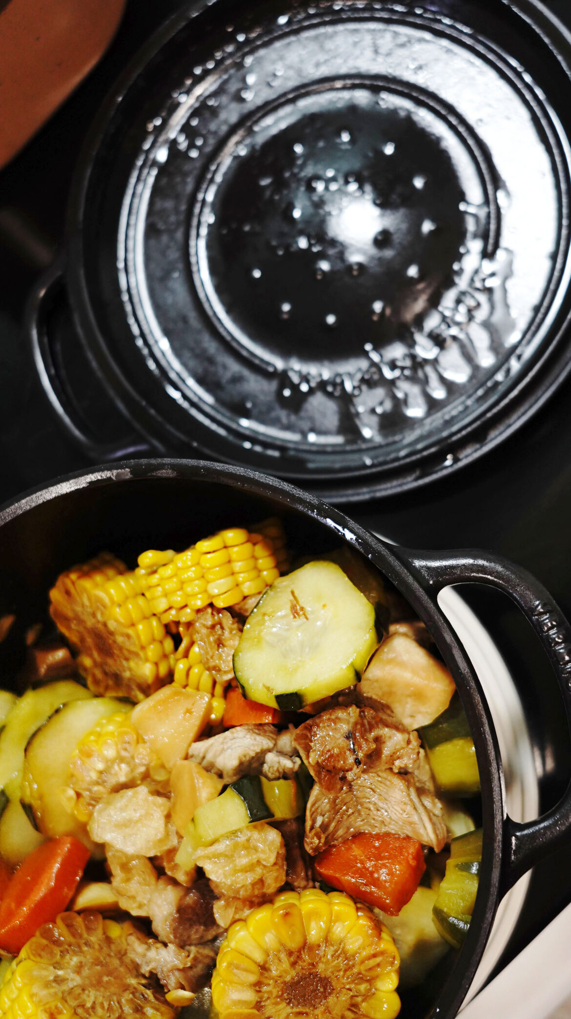 -用小V鍋悶出來的無水料理,除了食材出水量驚人以外,也有鑄鐵鍋獨特的鍋氣。