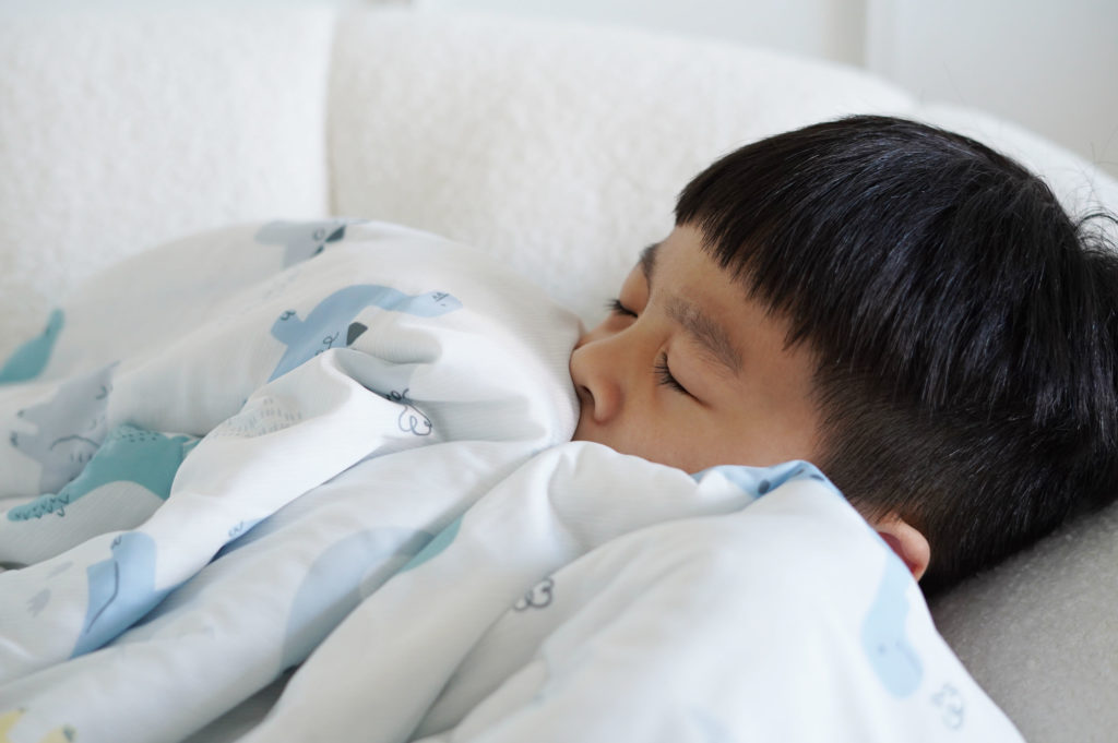 孩子呢?則是被子能多薄就多薄能不蓋最好,因為再薄都嫌熱!