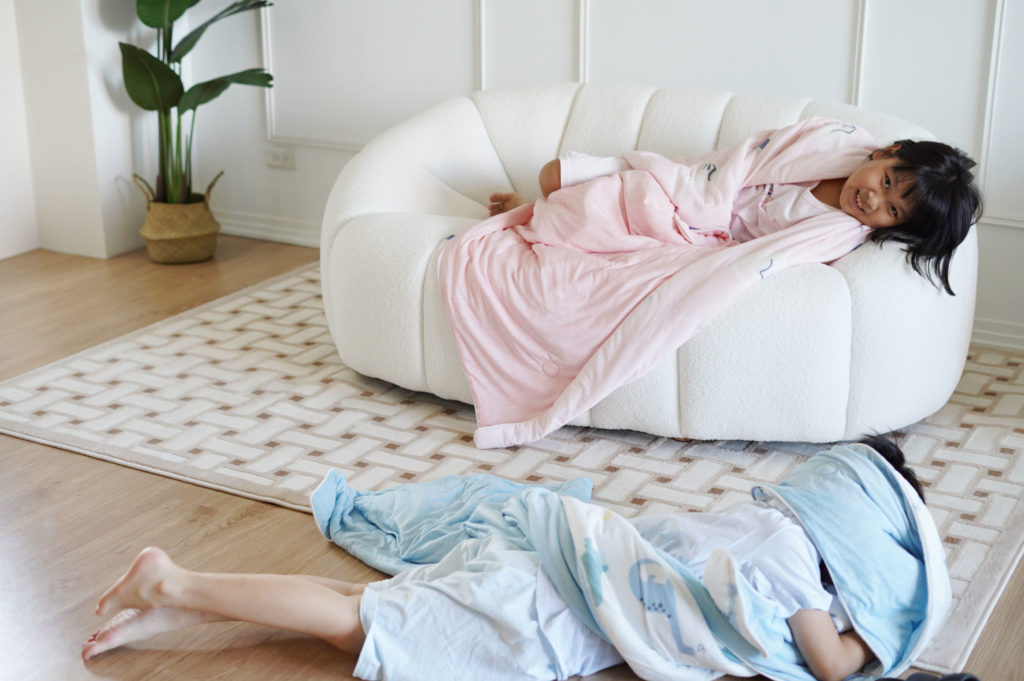 沒想到二位一試成主顧噎!!!!哈哈哈哈哈哈哈!而且一抱棉被就在家開始躺開始廢!根本就是廢到了一個極致!特別是我們家弟弟,去哪都要掛一條棉被在身上。睡覺的時候、喝奶的時候、看電視(躺在沙發或地上)的時候,還有太熱的時候????? 這陣子家裡冷氣壞掉,鵝子三不五時就打赤膊披著棉被晃來晃去,阿嬤看了覺得奇怪還曾經問過:「愷愷,你不是很熱嗎?很熱不要披棉被….」結果得到鵝子這樣的回應:「沒有呀!這個披著才會涼….我很熱!」