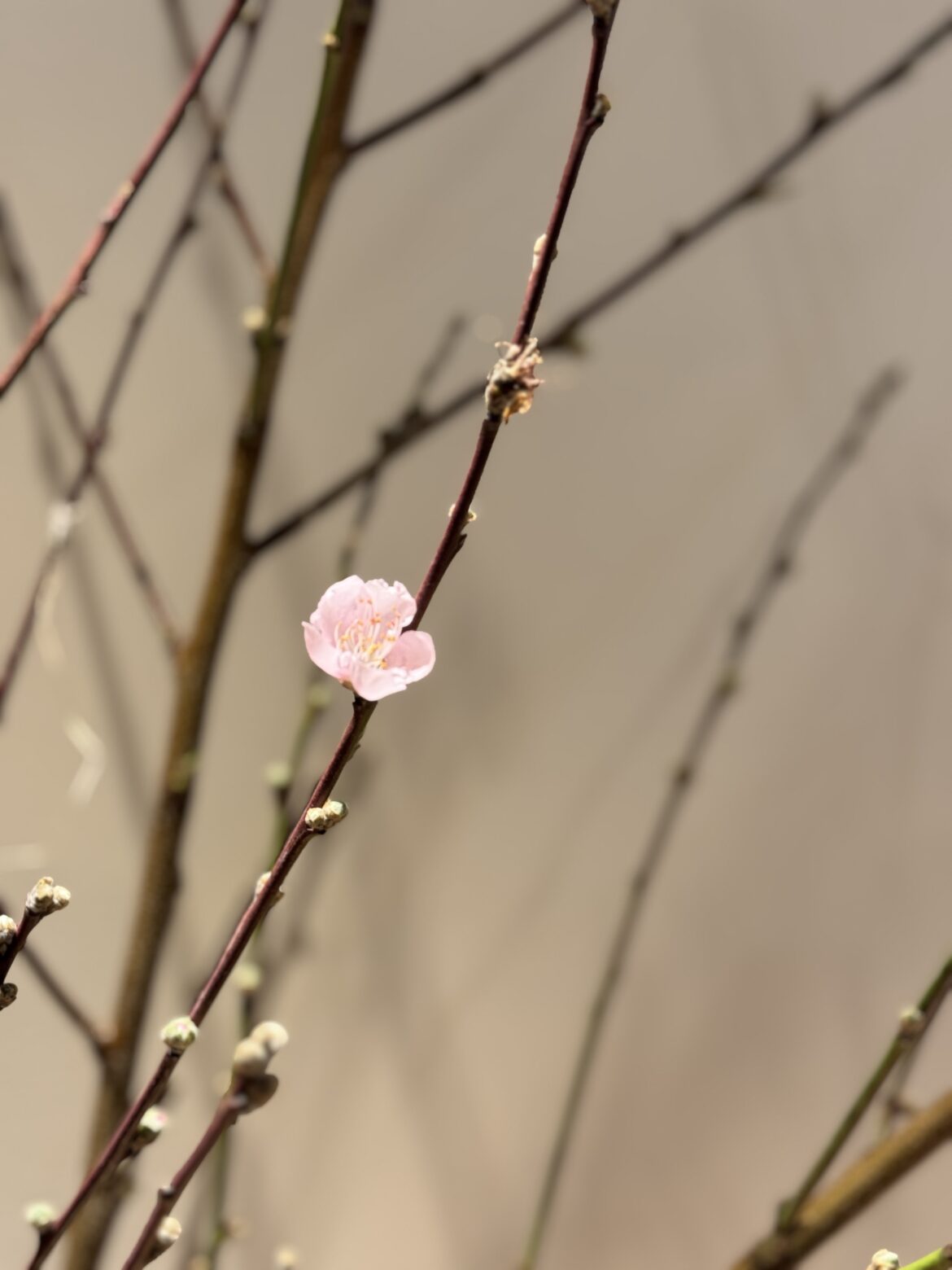 昨天的戰利品是一束桃花枝,枝頭上只有兩片葉子和甚多的微小花苞,其中只有一朵盛開的桃花…..要是以前,我才不會買這種光禿禿的樹枝回家。可這次我卻選擇了擁有最多花苞但是花開最少的那一束。