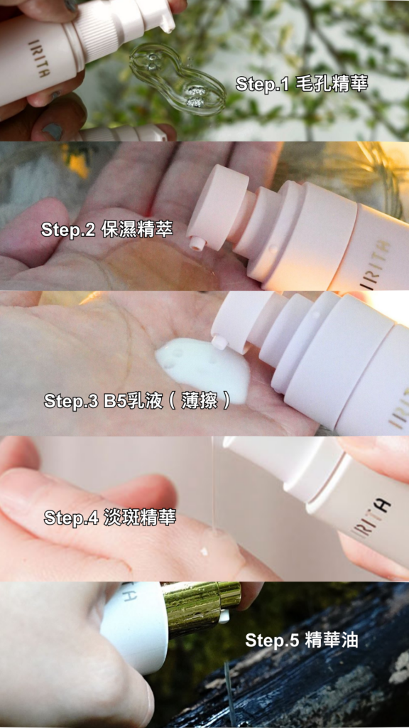 維持「一層水一層油」的邏輯,保養程序如下:毛孔精華➡︎保濕精萃➡︎ B5乳液➡︎淡斑精華➡︎ 精華油 。