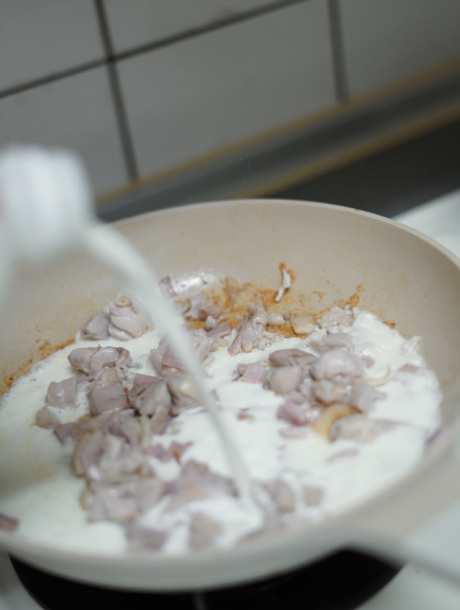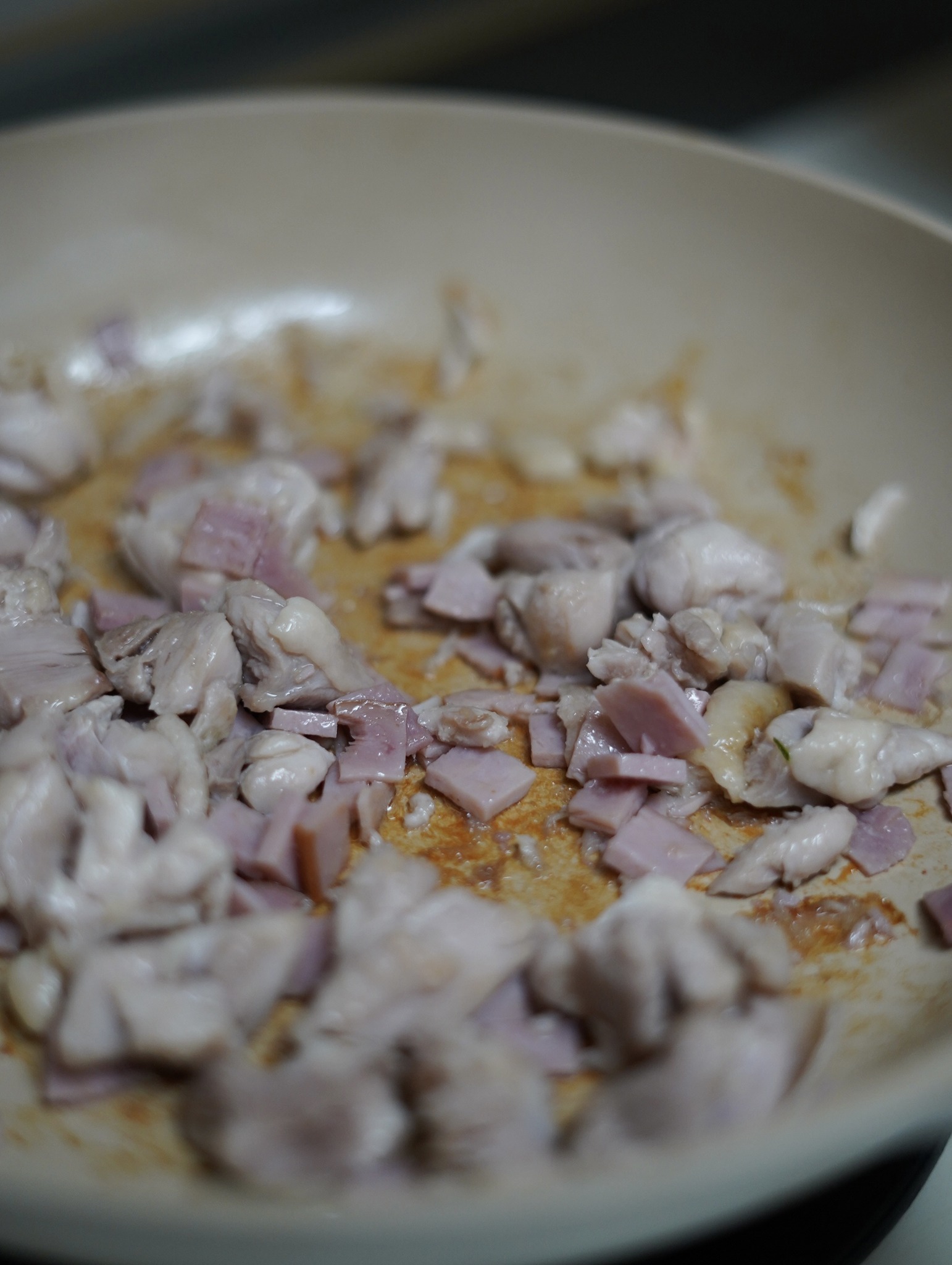 火腿與雞胸肉炒到邊邊有點焦焦的時候,就可以加入鮮奶煨湯底。