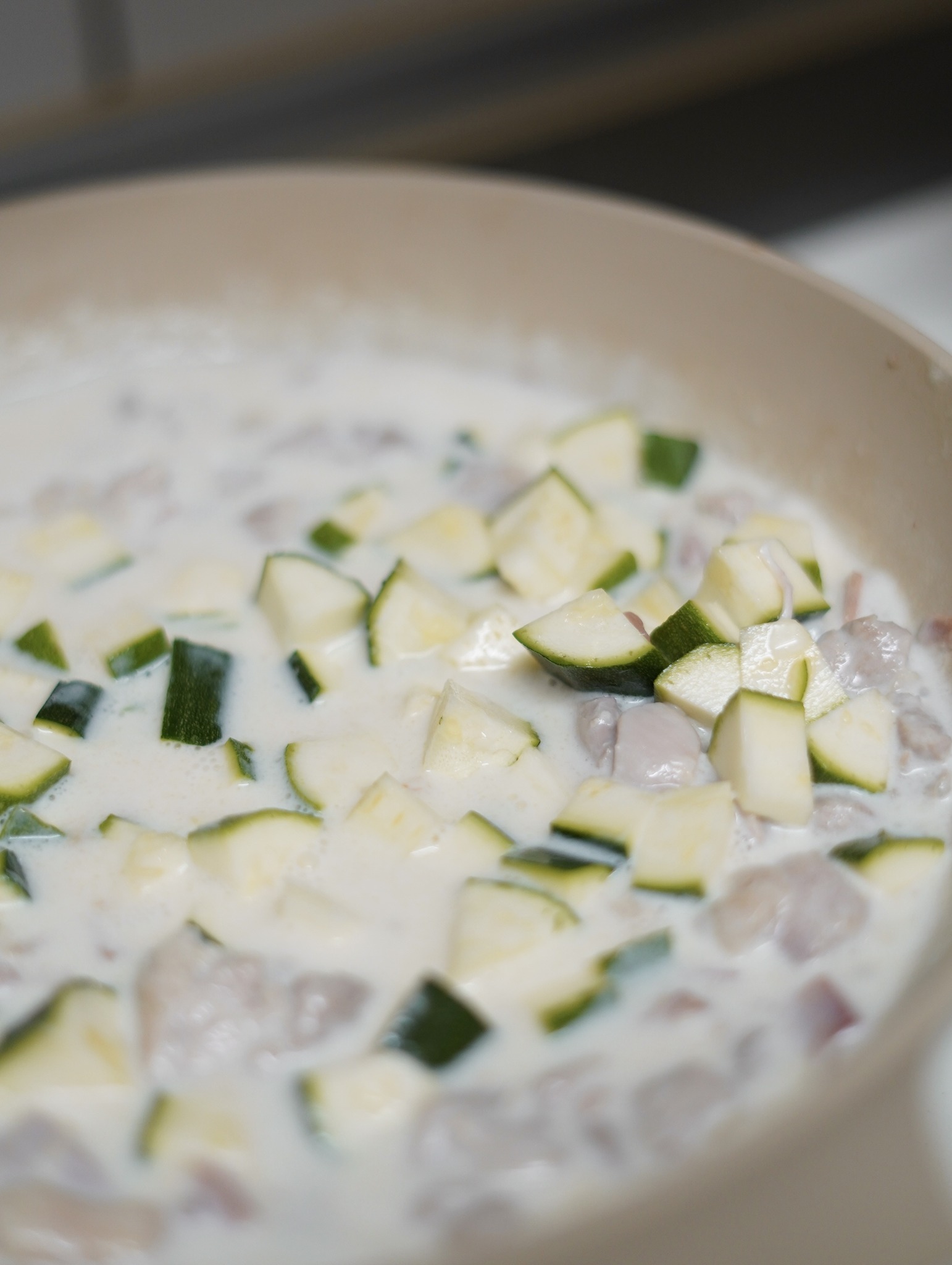 煨湯底的同時,可以將櫛瓜切塊;火腿與雞肉的香氣都與鮮奶融合以後,再將櫛瓜丟進去攪拌。