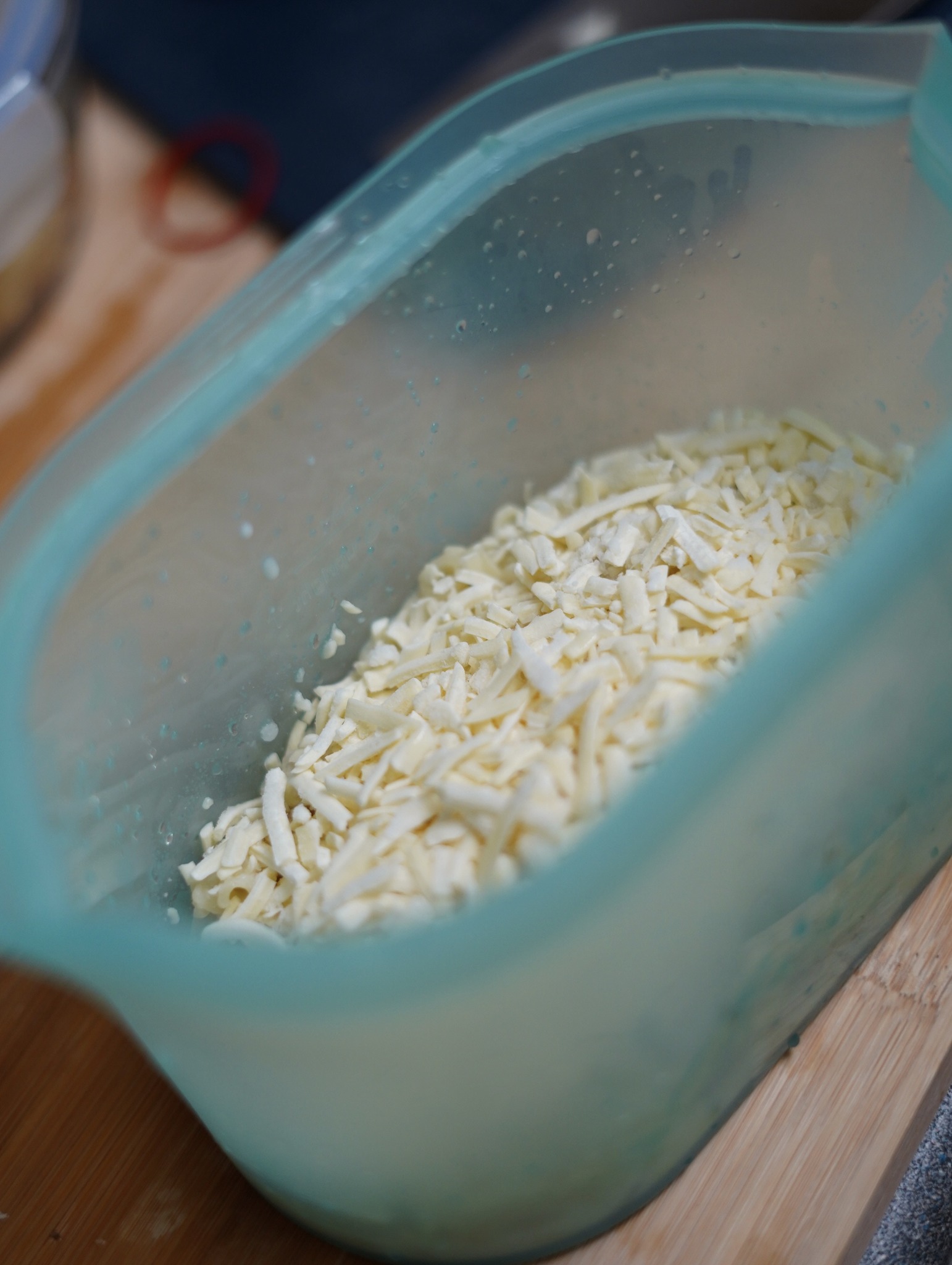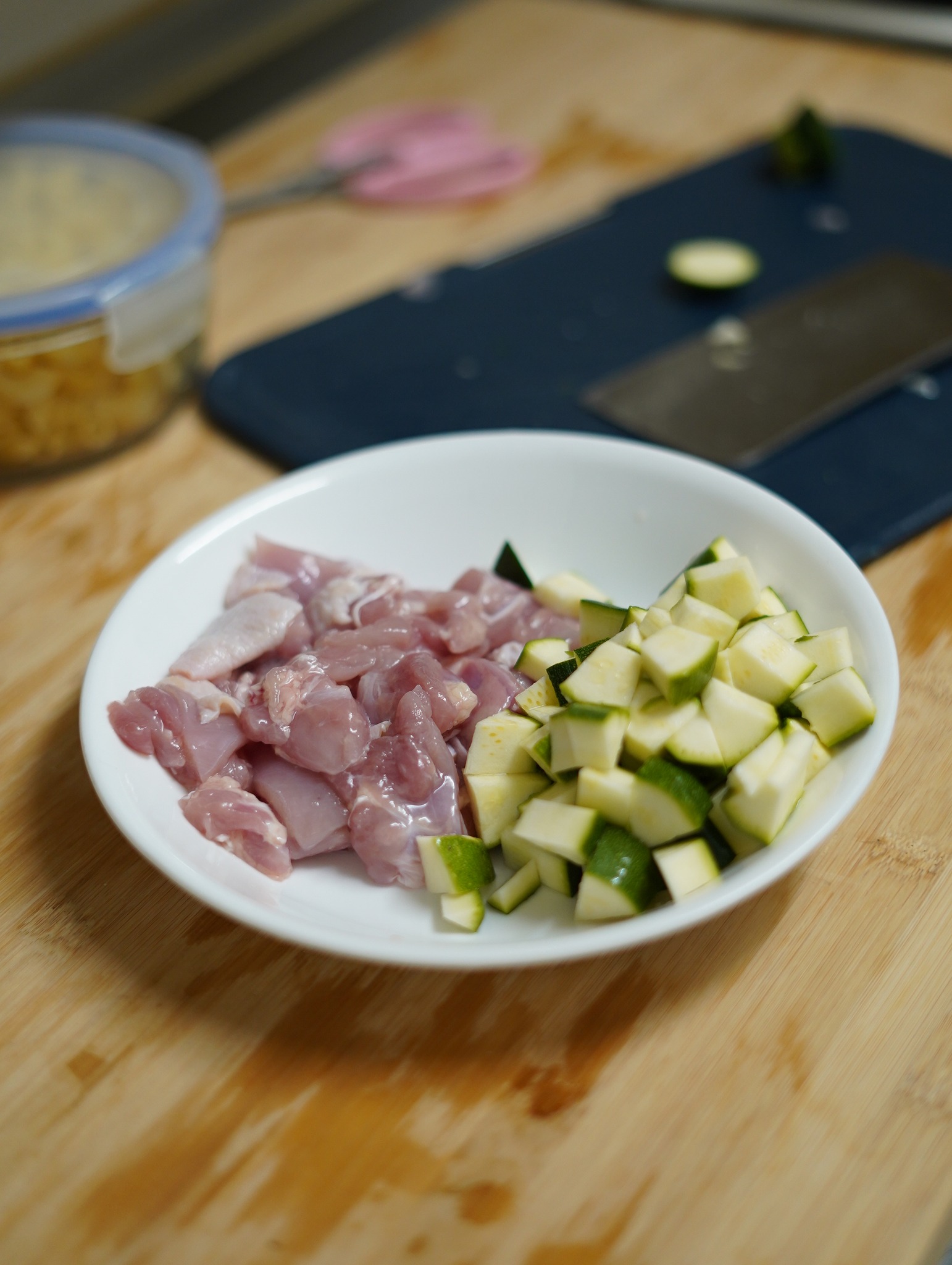 夥伴那天來工作室拿著製作派對點心時多餘的食材(清燙過的通心麵),,我想著孩子愛吃就整盒帶了回去,配著冰箱裡還有一塊的去骨雞腿肉和櫛瓜,快速地做了一道義大利麵。