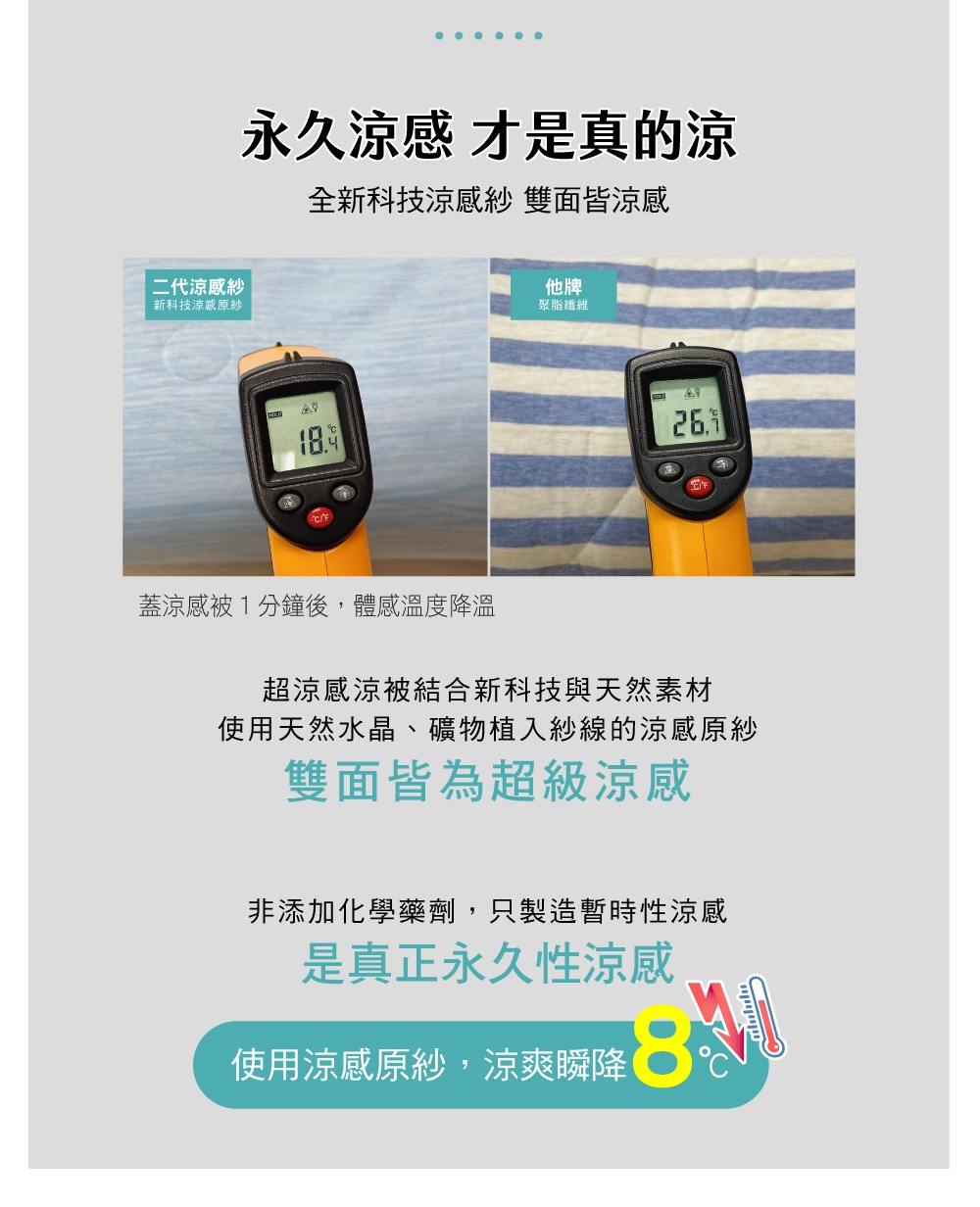 「格蕾」的涼涼與其他家不同之處,是屬於「物理性發涼」:被將天然礦物(滑石)中能降溫(不吸熱)的元素直接織進紗線裡,是一條「不用吹冷氣」就可以擁有涼爽的科技涼被。
