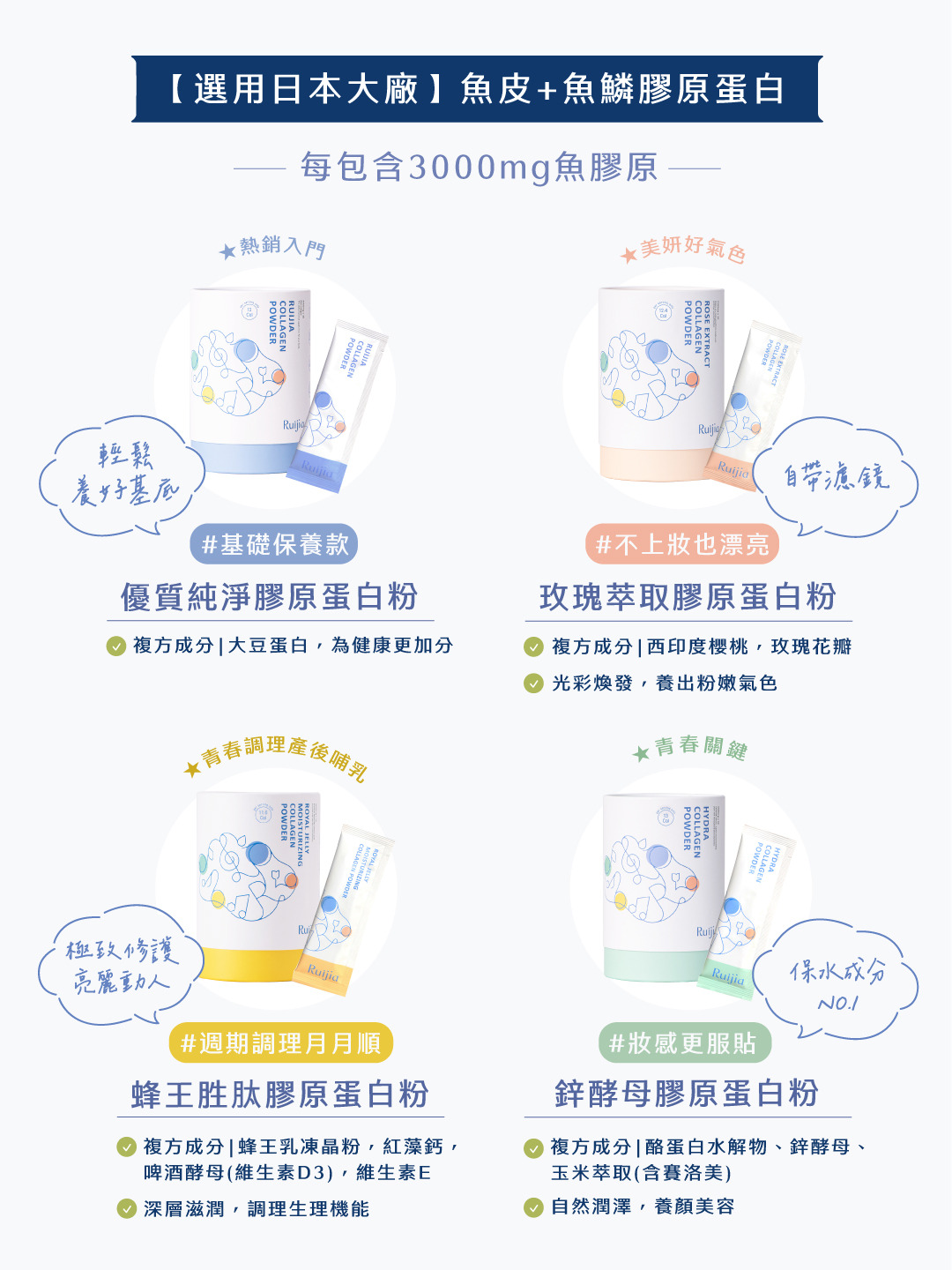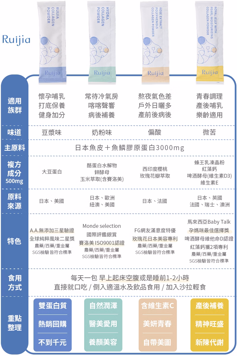 露奇亞亞總共有4種不同口味的膠原蛋白,我認為第一次嘗試的女孩挑選「一種」先養成習慣最重要。