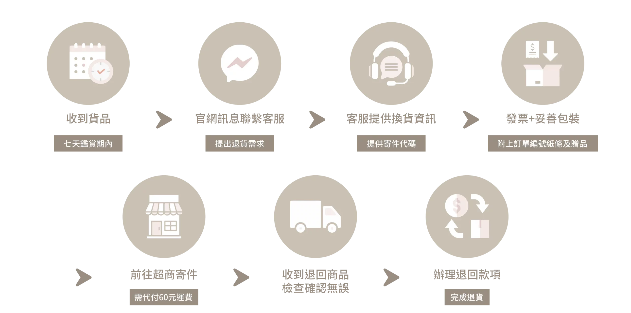 | 每張訂單僅提供一次免費退貨服務,為避免爭議發生,請確實驗收商品後再進行退貨,另商品優惠恕無法合併訂單計算。 申請退貨,約24小時內會收到簡訊退貨代碼,請於二日內至全省7-11辦理(如有問題請LINE通知客服(LINE ID:@chy9221h))。操作方式請詳閱ibon退貨操作教學說明。 |
